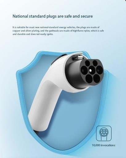 The national standard plug ensures safety. It is suitable for most new national standard energy vehicles. The pins are made of copper with a silver-plating process, and the gun head is made of high flame-retardant nylon material, which is safe, durable, and not prone to ignition.