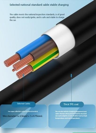The selected national standard cable ensures stable charging. The cable meets national inspection standards, has good quality, and is not prone to heating, ensuring safe and stable charging for the car. The selected cable is made of copper cable that meets international standards, with a wire diameter size of 3.5×2.5m㎡++1×0.75m㎡. It has a thick TPE outer sheath, which is a cable for electric vehicle charging equipment. It is strong, wear-resistant, and can easily adapt to harsh weather conditions such as high and low temperatures.