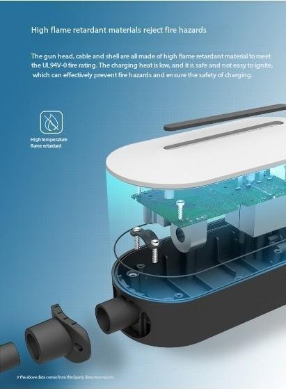 Both the gun head, its performance, and the shell are made of high flame-retardant materials, meeting the UL94V-0 fire protection rating. It generates low heat during charging, is safe, and is not prone to ignition, effectively preventing potential fire hazards and ensuring charging safety.