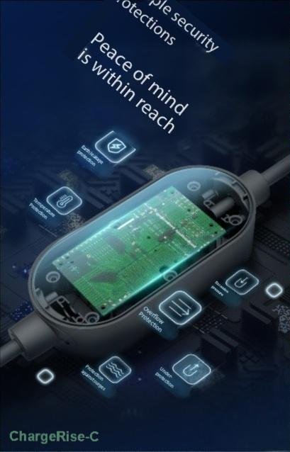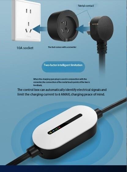 Second, it has intelligent current limiting. When the charging gun plug is used in combination with the converter, through the connection feedback of the metal contacts of the two, the control box can identify the electrical signal and limit the charging current to a maximum of 8A, ensuring safe charging.